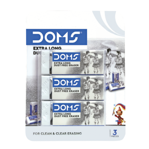Keep your work neat and smudge-free with the DOMS Extra Long Dust Free Eraser Pack of 3. Designed with superior quality material, these erasers provide soft, smooth, and effortless erasing without leaving messy residue behind. The dust-free technology ensures clean pages, making them ideal for students, artists, and office use.