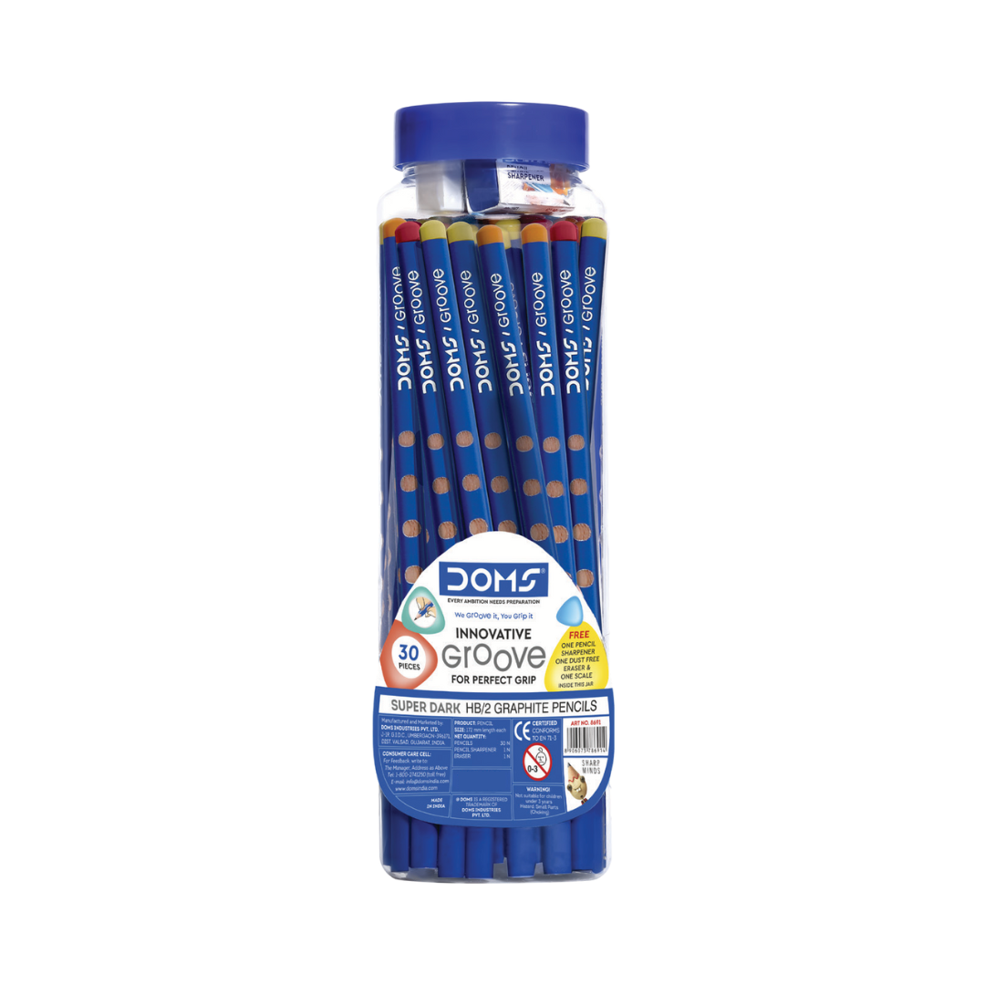 The DOMS Groove Pencil Jar of 30 is a smart stationery essential that combines quality, comfort, and value. Each pencil is crafted with extra-dark graphite lead for sharp, clear writing and features a unique grooved ergonomic grip that makes writing comfortable and strain-free, especially for students.