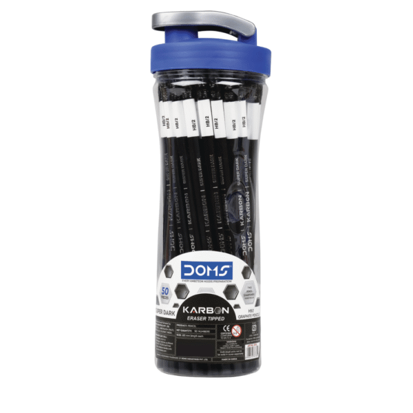The DOMS Karbon Pencil Jar of 50 is the ultimate stationery essential for schools, offices, and bulk users. Each pencil is eraser-tipped for quick corrections and made with super dark graphite lead that ensures bold, sharp, and smooth writing every time.