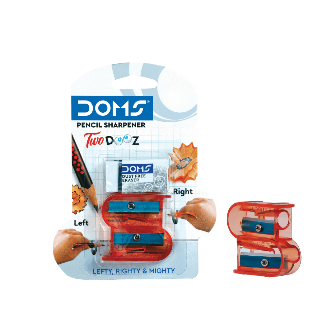 The DOMS Two Dooz Pencil Sharpener with Dust-Free Eraser is designed to make sharpening smarter, cleaner, and more efficient. With its ambidextrous design, it can be used comfortably by both right and left-handed users. The scientifically placed angled blade ensures fine-point sharpening without breaking the lead, while the firm grip body makes it easy to hold.