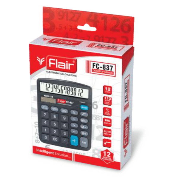 The Flair FC-837 is a reliable and powerful desktop calculator designed for precision and efficiency. Its robust features make it an excellent choice for anyone who handles complex calculations on a regular basis.